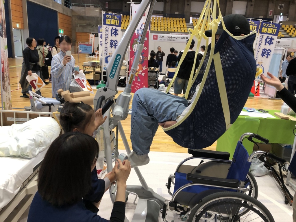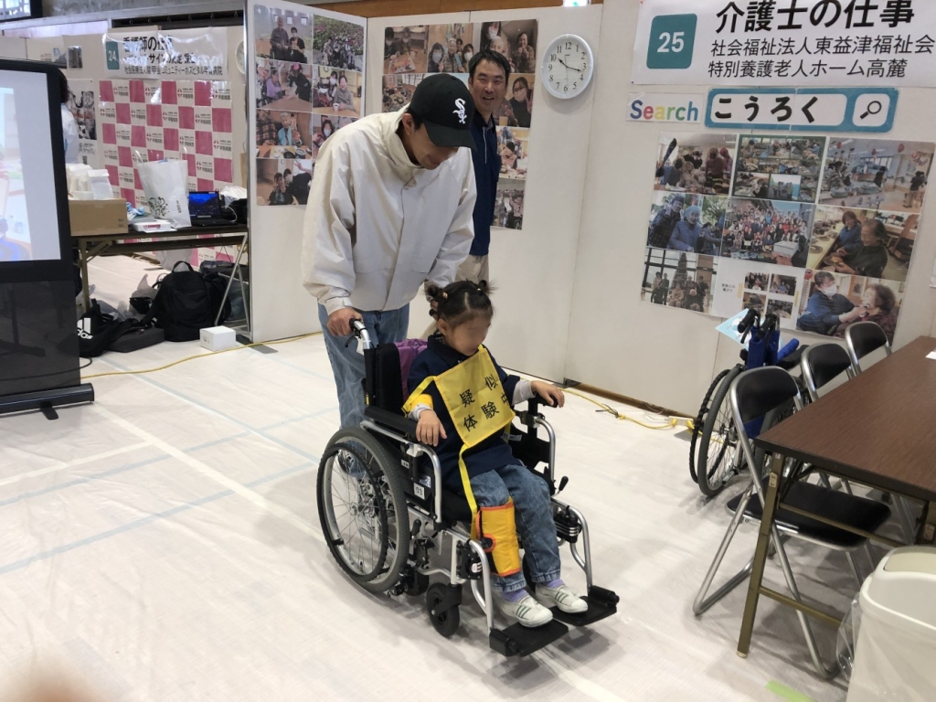 高齢者疑似体験を行い、利用者の気持ちを体感したあとに、介護士として、介護ベッドや車いすなどの介護機器を使った仕事をします。また、利用者に楽しんでいただけるようなレクリエーションも行います。