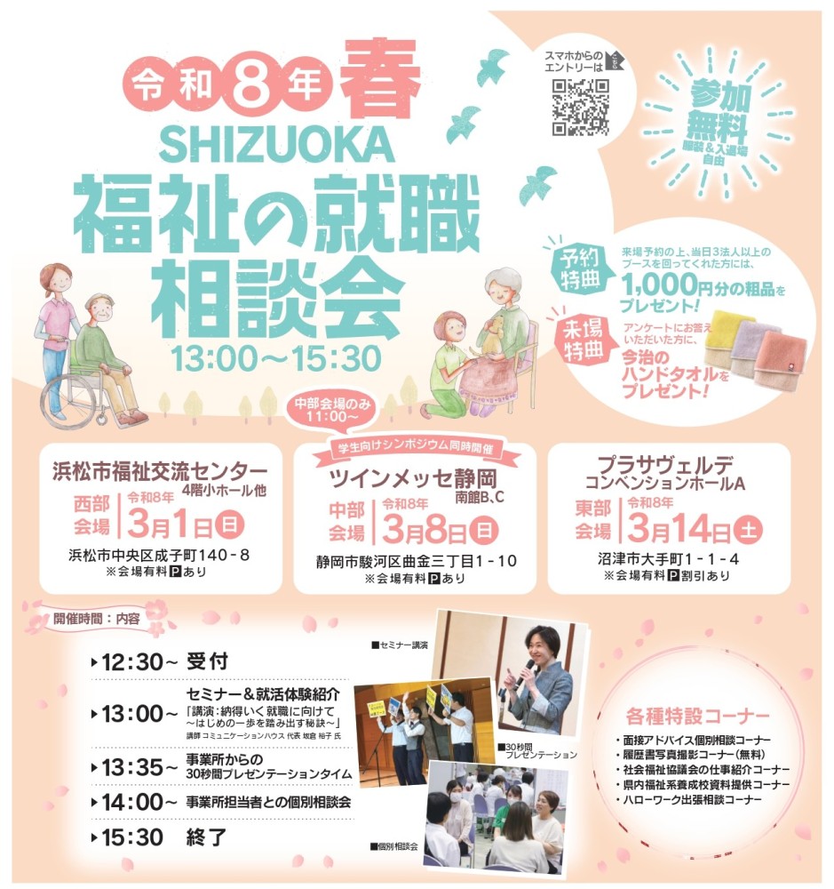 2026年3月1日(日)・8日(日)・14日(土)に、静岡県、静岡県社会福祉協議会 静岡県社会福祉人材センターが主催する福祉の就職相談会が開催されます。