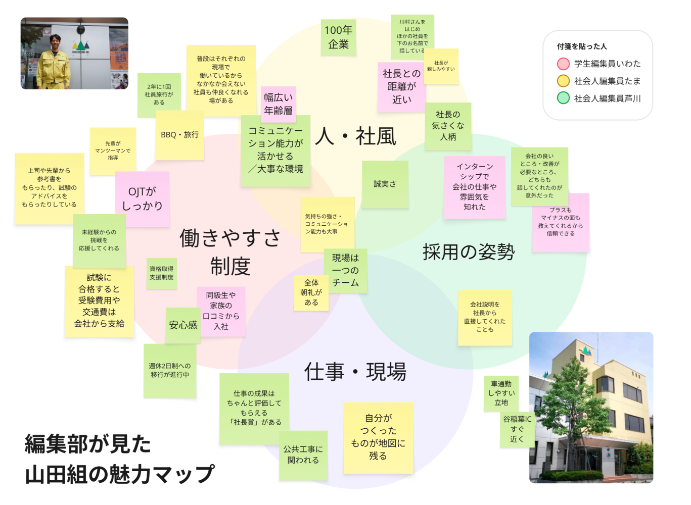 入社2年目の川村さんを取材した後、編集部メンバーで「山田組ってどんな会社だった?」をテーマに、感想を付箋に書き出してみました。それぞれが驚いたこと、魅力に感じたことをペタペタ貼っていくうちに、会社の特徴が自然と浮かび上がってきました。ここでは、その付箋を一枚ずつ見ながら、私たちが感じた山田組さんの魅力を紹介していきます。